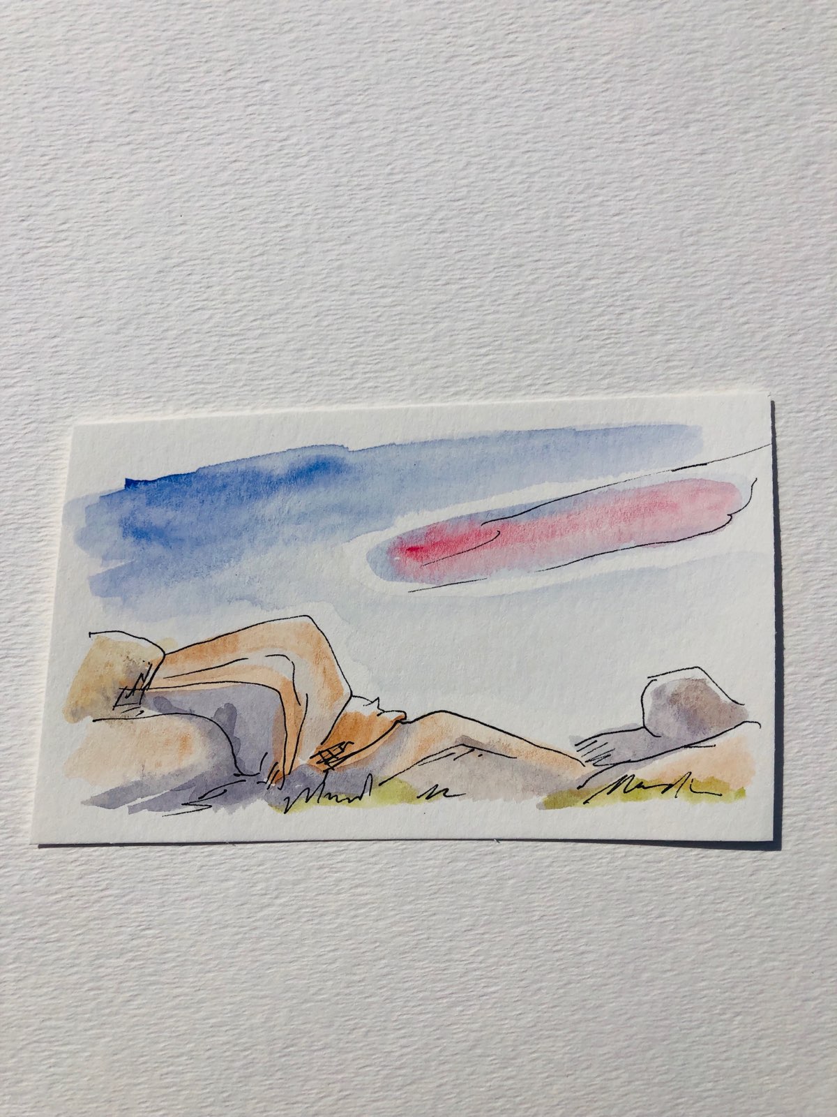 Here’s some more plein air little sketches. They’re all watercolor and pen & ink, what started as gestural landscapes morphed into abstract suggestions of the rock formations around the van.
